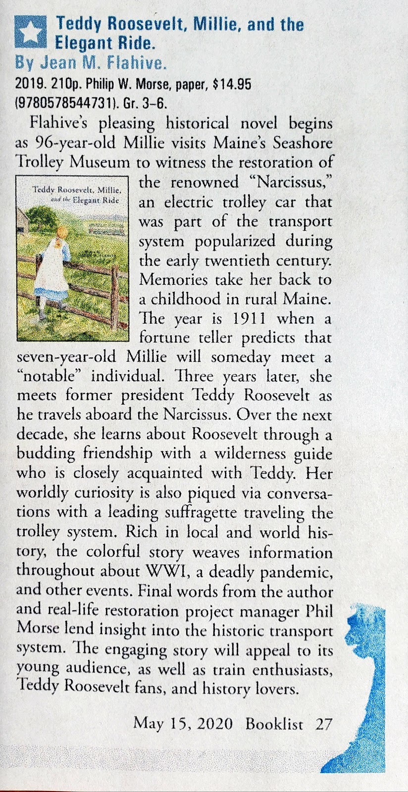 Three years later, when a new trolley line is up and running in her hometown, Millie meets former President Teddy Roosevelt as he travels aboard the Narcissus. Over the next decade, she learns about Roosevelt through a budding friendship she develops with a wilderness guide who is closely acquainted with Teddy. Her worldly curiosity is also peaked via informative conversations she has with a leading suffragette traveling the trolley system.