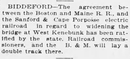 This post will focus on the West Kennebunk and Kennebunk portion of the original Sanford & Cape Porpoise Railway. It will mention/refer to several of the other community connections, as the original line was used by the railways that absorbed the Sanford & Cape Porpoise beginning in 1903