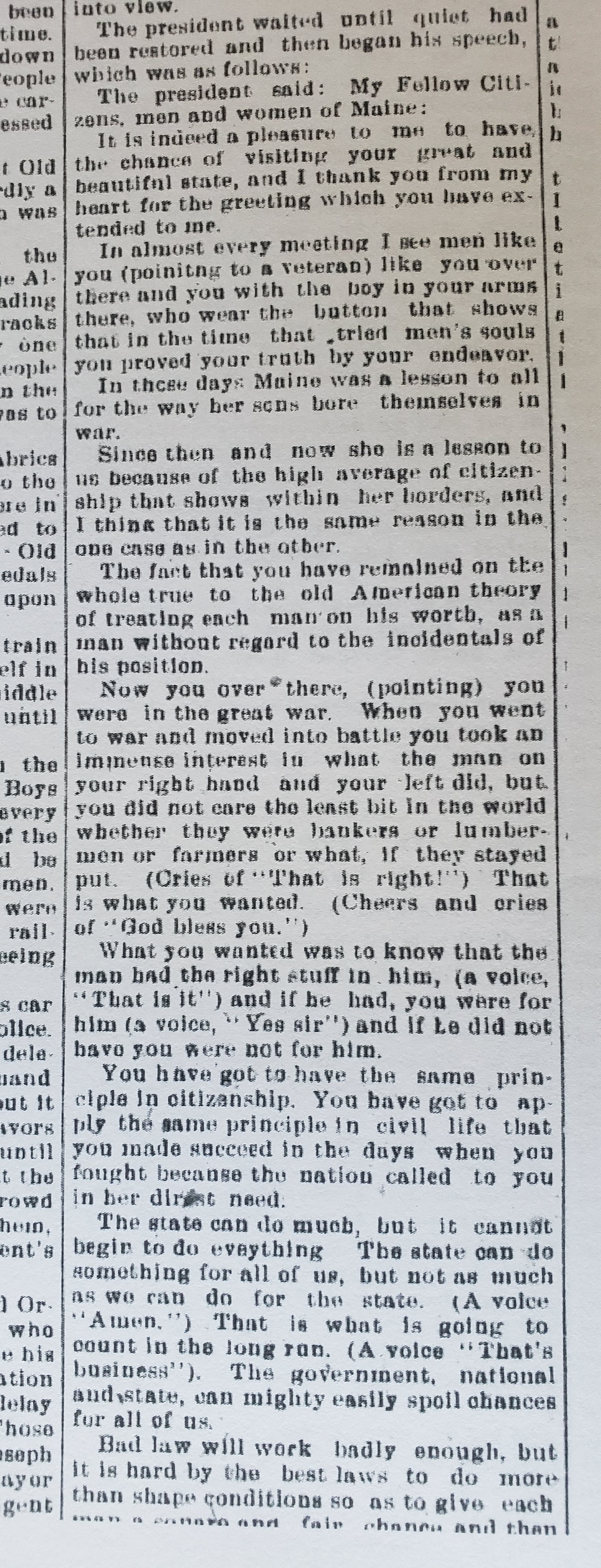 It is indeed a great pleasure to be greeted by you today, as it has been to be greeted by people all over Maine. I can see by your faces that the old American spirit still burns as freely as ever. Driving through the thronged streets I see men who wear the button which tells that they fought in the great struggle. As soon as I saw the mounted policemen I knew that some of them were old cavalrymen.